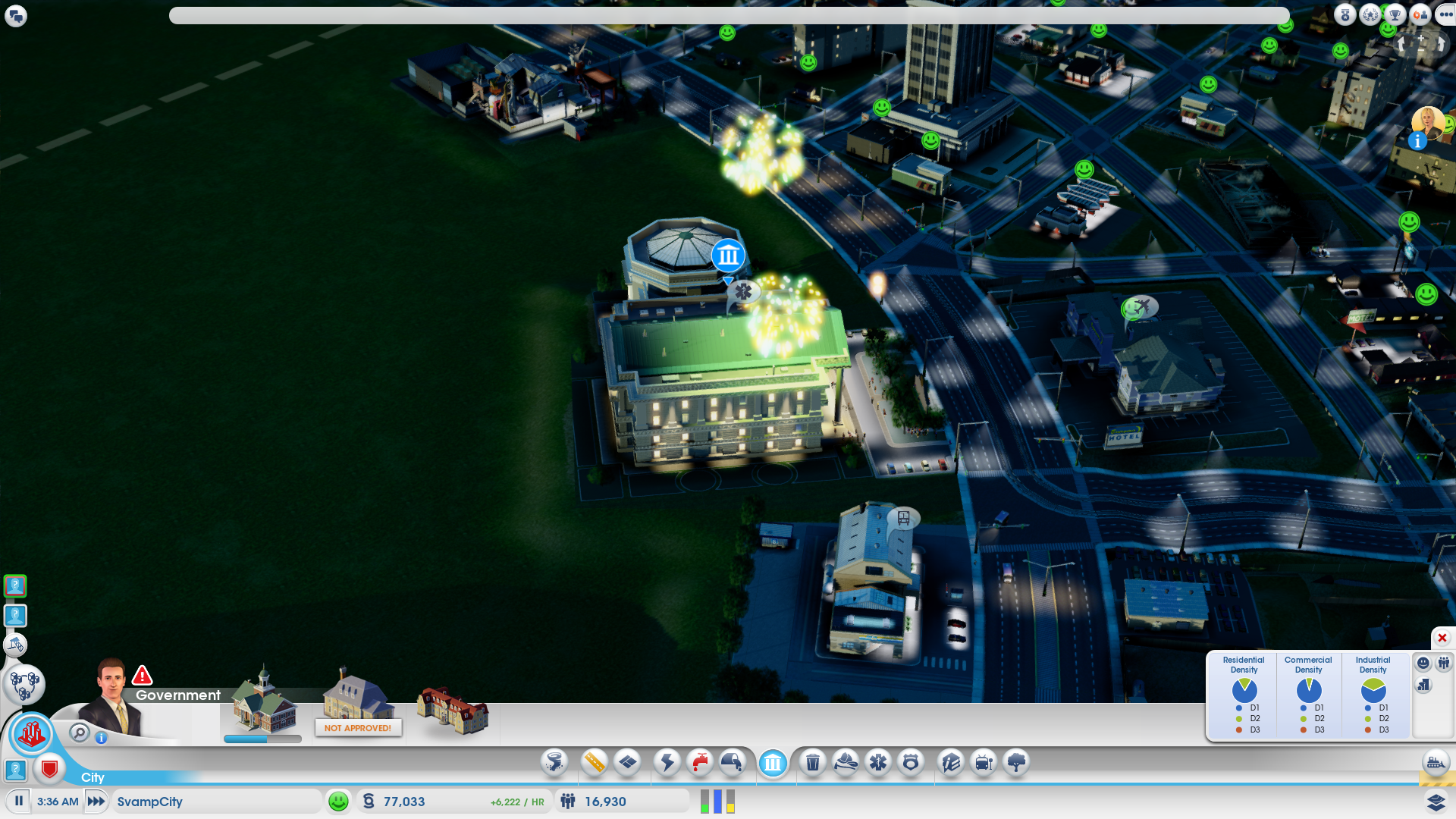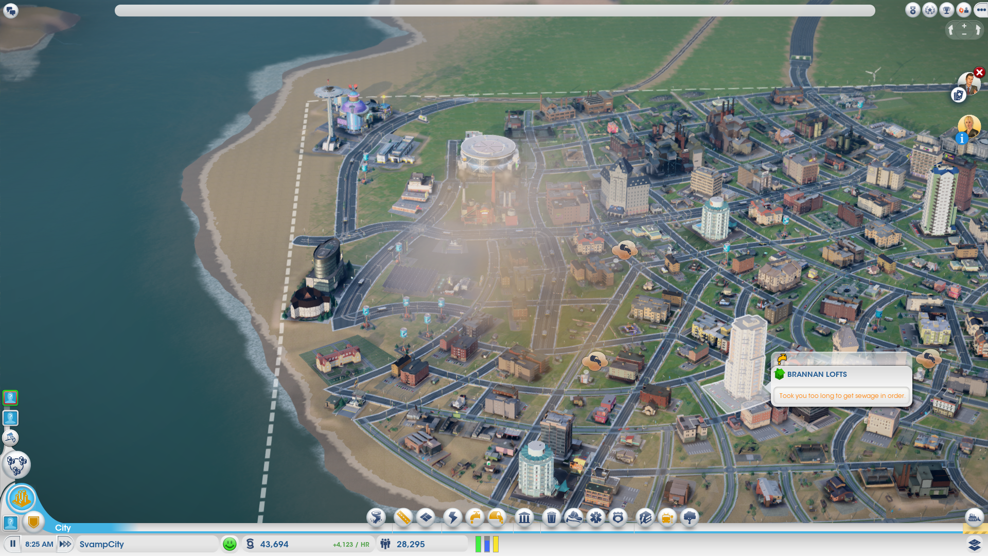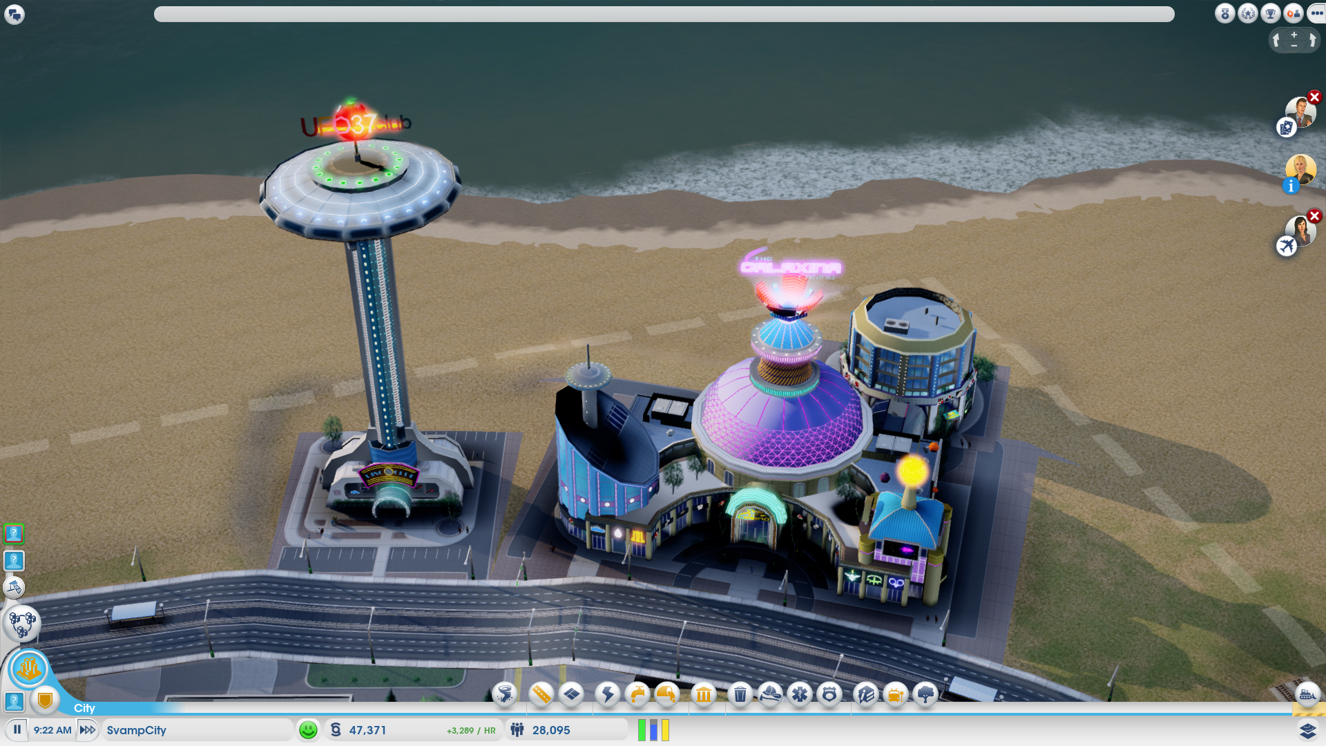 De städer du bygger kan du profilera på olika vis för att locka olika typer av invånare. Peter Ahonen från Kraid till exempel, byggde en stad han kallade ”Pit of Despair” där endast riktigt fattiga bosatte sig i shanty-liknande bosättningar. En stad med få arbetstillfällen och enbart industriarbeten. Själv satsade jag på ett nöjespalats i stil med Las Vegas. What happens in SvampCity, stays in SvampCity – så att säga.