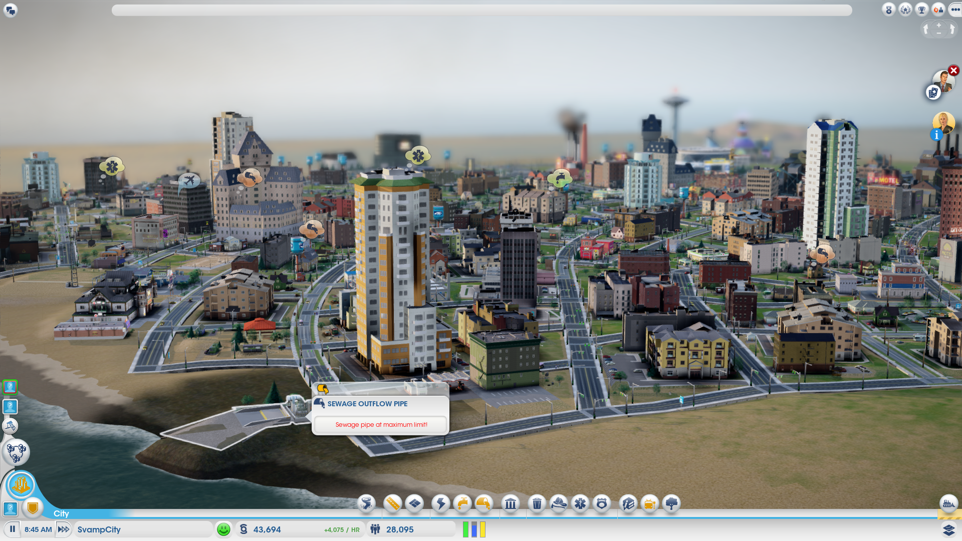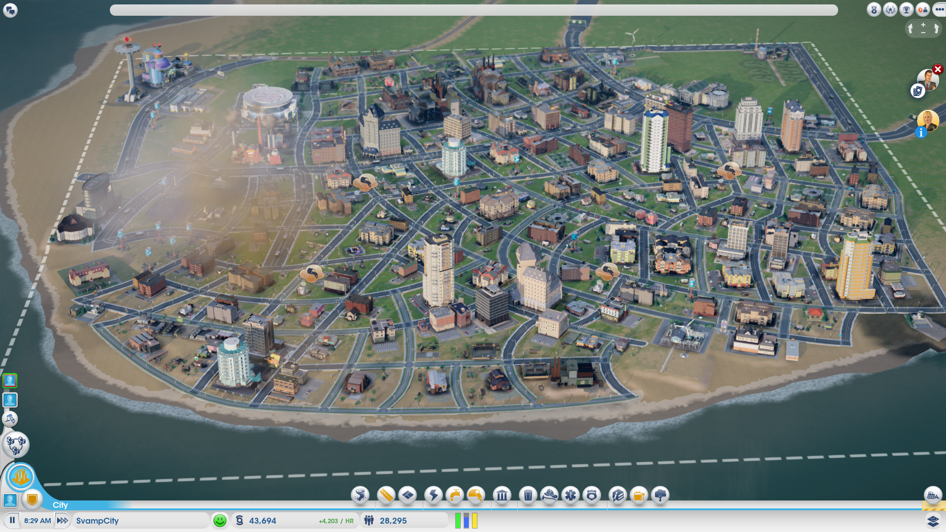 Det finns också ett intrikat onlinesystem inbakat i SimCity. Om du vill kan du släppa in andra spelare som dina grannstäder och handla och köpslå med dem. Ni kan också ha gemensamma mål, dels genom miniuppdragen jag nämnt men också i gemensamma ”skrytprojekt” som kräver enorma resurser.