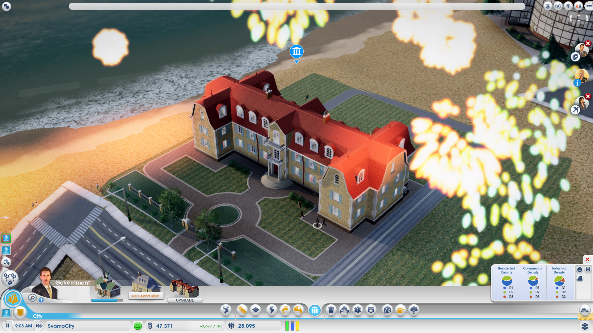 Byggnader är också uppgraderingsbara. Är till exempel min brottsstatistik på väg åt fel håll behöver jag kanske inte slanta upp för en helt ny polisstation utan kanske klarar mig med att bygga ut den befintliga. Stadshusets påbyggnader är väldigt ledande inför vilken sorts stad du vill ha, du kan inte vara expert på allt utan väljer mellan olika extra avdelningar – porträtterat som flyglar på stadshuset som jag själv placerar som påbyggnader.