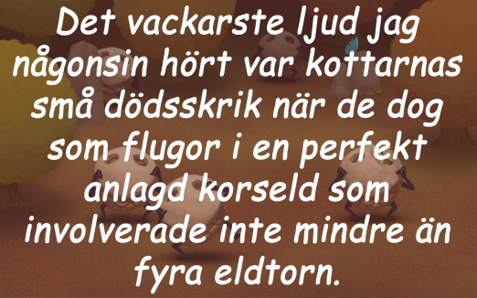 Jag bär på en naiv tro att den mysiga stämningen och plinke-plonkiga-musiken ska vara balsam för min själ, när jag i själva verket bara sitter och skriker ”Mina ba-ah-ahrn…!” när våg efter våg med spindlar ninjar sig förbi mina listigt placerade torn och mumsar i sig hela jädrans dagiset. Detta till trots, älskar jag det här spelet.