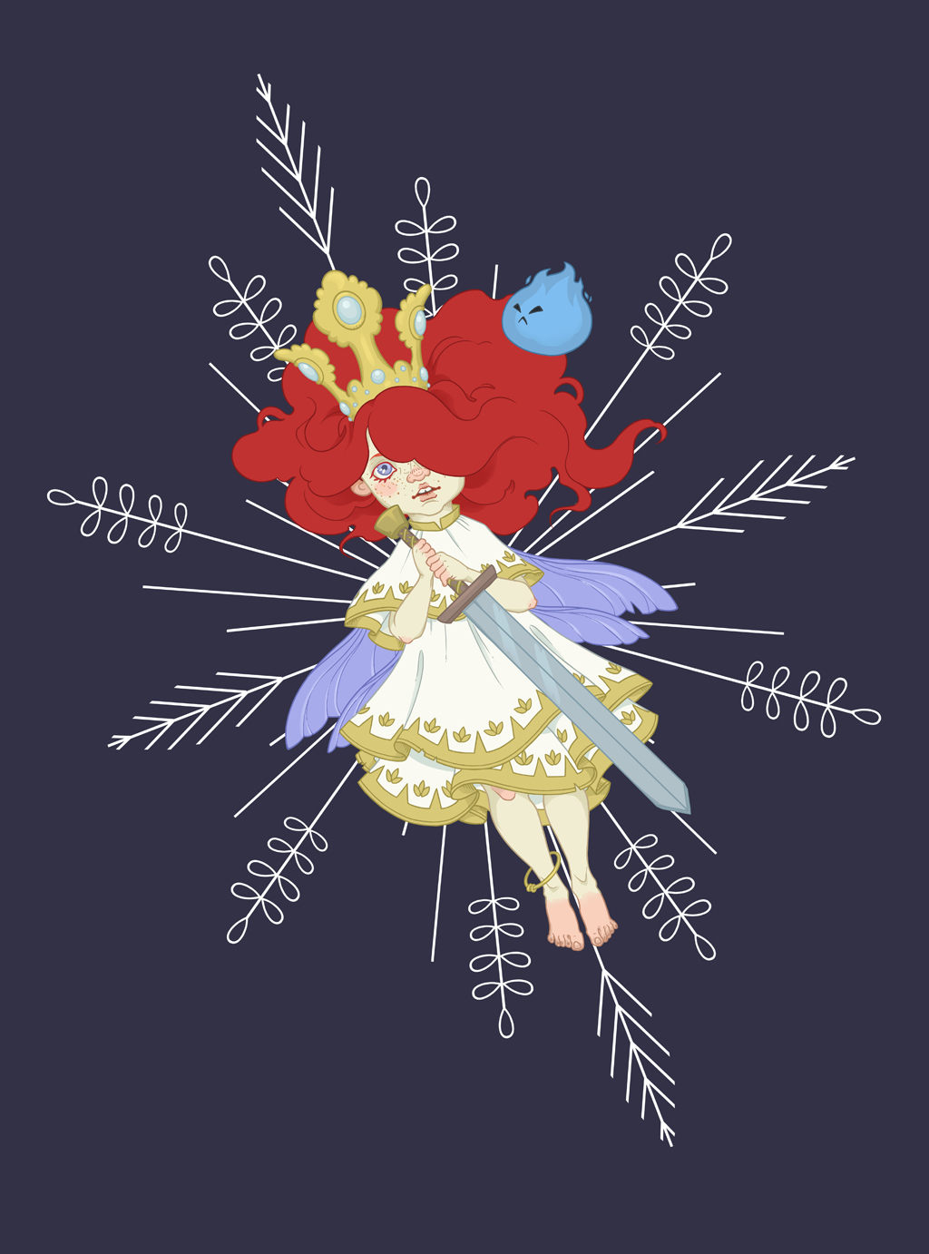 Jag tror att många egentligen inte riktigt har koll på hur Aurora ser ut. Vi kan varenda söm i Links gröna tunika, men när man tänker tillbaka på Aurora minns nog många mest det svallande, röda håret och en vit klänning. Så var det för mig, jag fick bildgoogla för att minnas detaljer, och satt förvånat och tänkte: ”Jaha! Hennes klänning skiftar ju nästan i gult. Har hon handskar på sig, det såg aldrig jag!” Så min tolkning lutar sig snarare på hur jag upplevde henne just där och då, och är väldigt John Bauersk, ja faktum är att hennes krona är stulen från hans prinsessa Tuvstarr rakt av. Precis som med Tifa ville jag få henne att se lite åtgången ut, med revor i klänningen och fötter som faktiskt ser ut som om de gått genom en kall, grå skog barfota.