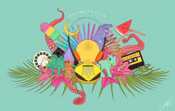 Så här blev bilden, den fick heta ”Retrophilia” och blev en sammanfattning och försköning av de färggrannaste bitarna från barndomen. Barndomen kanske inte alltid var så idyllisk, fast när nostalgibrillorna åker på så inbillar vi oss det.