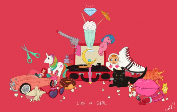 Först gjorde jag ”Like a girl” (som blivit en etablerad slogan i jämställdhetskretsar) och bilden handlar om att lyfta ”tjejgrejerna” och hylla dem. Flickors leksaker bär ofta på en negativ laddning, att de ska vara fördummande och göra flickor passiva, men jag tänker att det inte är färgen rosa (eller leksaksspisen, ponnyhästen eller nagellacket) i sig som bär på dåliga egenskaper, det är när föräldrar och samhället begränsar valmöjligheten till bara rosa. ”Här, här är dina flicksaker, det är vad du ska leka med, och ge djävulen i allt det andra, det är inte för dig.”