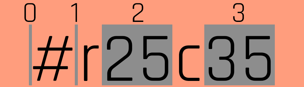 Så när vi delar upp strängen “#r25c35” till en array med allting utom siffror som avgränsare så blir värde 0 det som är framför #, det vill säga ingenting, värde 1 det som är mellan # och r, det vill säga ingenting, värde 2 det som är mellan r och c, det vill säga 25 och värde 3 det som är efter c, det vill säga 35. Sådär, solklart?