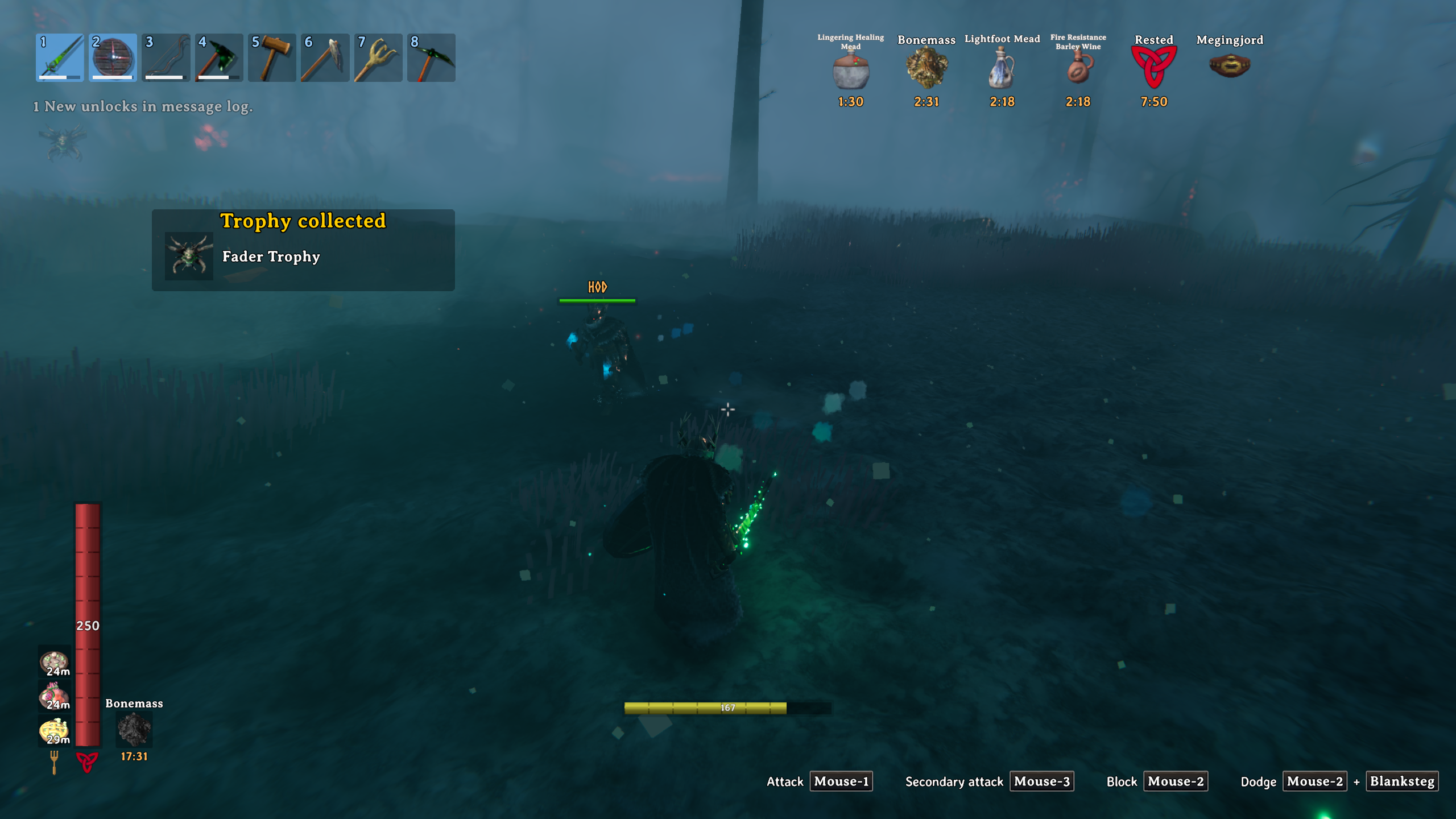 Nere i dimman i alla fall, så fanns Mistlands fiender, insekterna. Och utöver dessa fanns även den hemska Gjallen, en stor flytande hindenburg-amöba som tutar som ett lastfartyg ute i dimman innan den skjuter eldbollar och släpper ner fästingar på en. Man måste nästan se den själv för att förstå vad jag menar, men det är precis som jag säger. En slags levande insektsballong, som tutar och sprutar eld. Den fick mig ett par gånger, i lite halvjobbiga situationer.