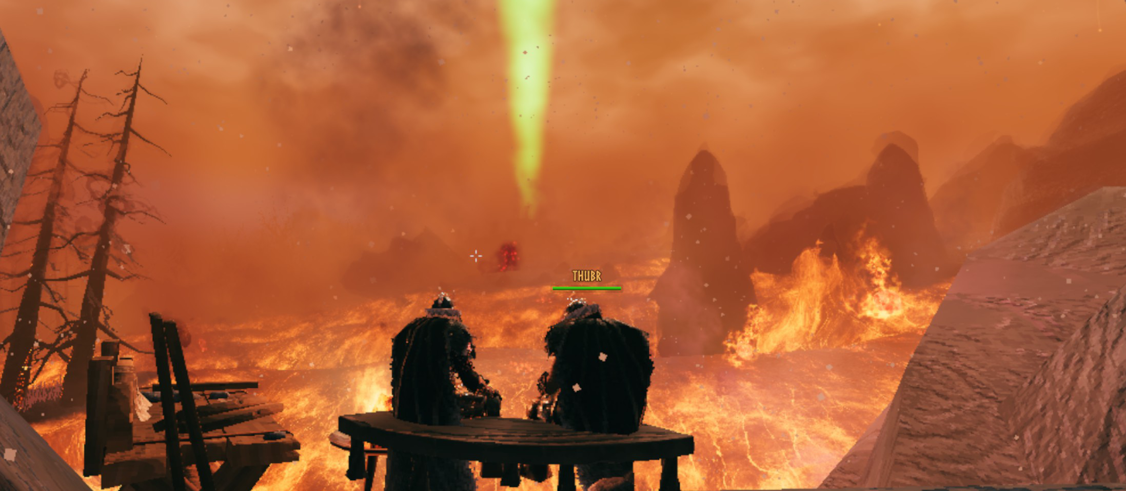 Det är ett intressant område, får man säga. Som namnet skvallrar om är det alltså konstant dimma nere på marken som inte lättar förrän du kommit upp på klipporna ovanför. Du måste ha med dig en speciell wisplight som gör att du iaf kan se några meter runt om dig. Annars behöver du bygga speciella lampor och göra ett slags nätverk av synliga “fyrar” ute i dimman som gör att du hittar hem. Vi gjorde istället så att vi byggde egna vägvisare uppe på klipporna och höll oss till dessa. Stora träpelare med en arm som pekade oss i hembasens riktning blev livlinan här, när vi kämpade för att ta oss hem innan natten. Att se ens kamrater hoppa mellan klipporna i solnedgångens motljus är en av många stunder i Valheim då man förundras över hur något så low poly kan vara så jävla snyggt och stämningsfullt.