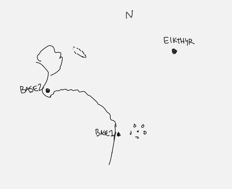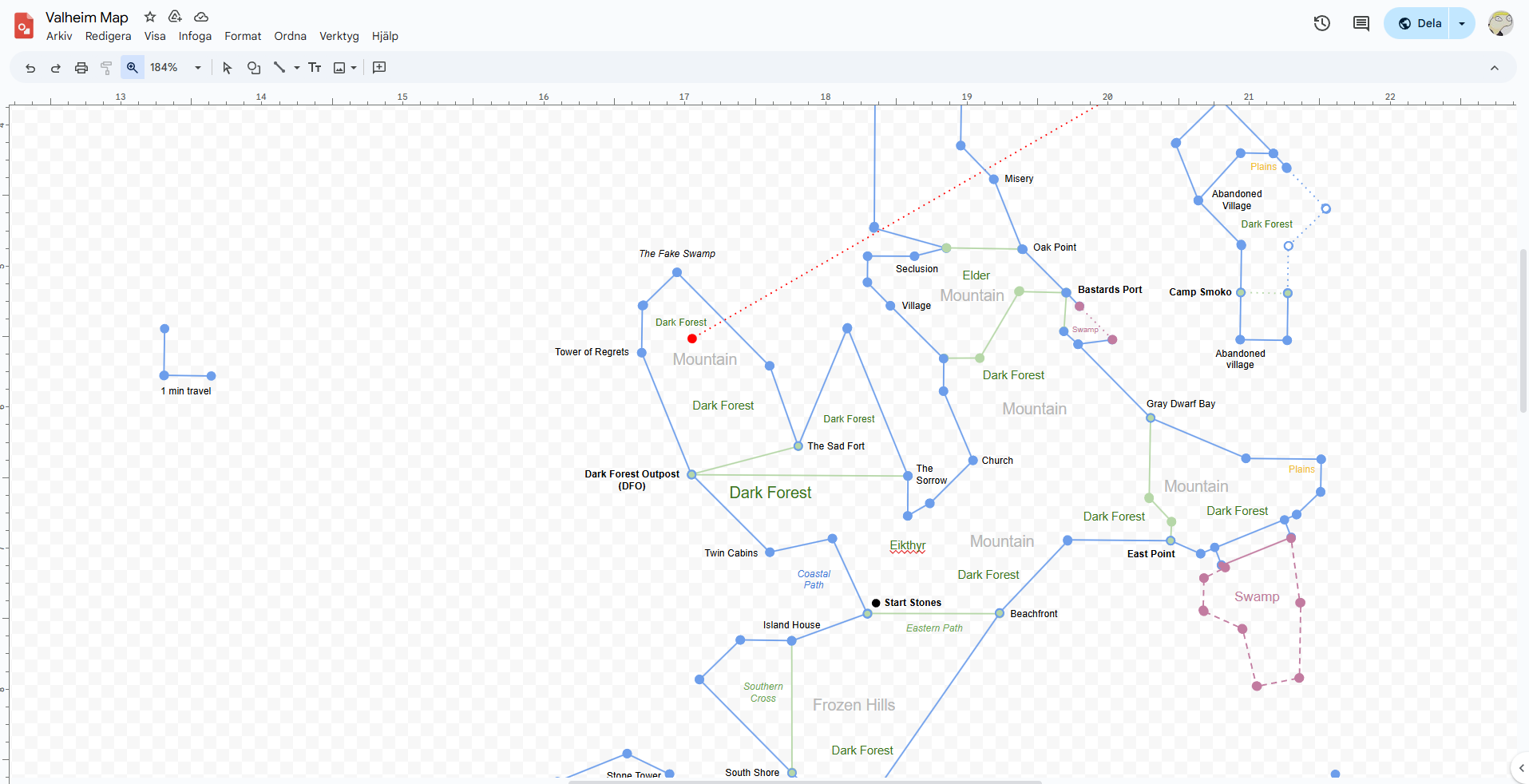 Immersive mode innebär att man inte får använda portaler, och dessutom stänger vi av världskartan. Vi får helt enkelt “figure it out”. Går solen upp där borta så borde den här riktningen rimligtvis vara norrut. Och dessutom är Yggdrasils grenar i himmelen tydligen alltid sträckta från öst till väst. Och på den vägen var det då. Vi satte igång och famlade ganska mycket i början, gick vilse framförallt. Direkt stod det klart för oss att vi nog behövde skapa en karta på något sätt. Vi började frihanda lite kartor i paint medans vi irrade runt och försökte kraftsamla för första bossen Eikthyr. Man blev bättre på att läsa landmärken och försöka hålla sig till kusten. Skulle vi ta oss in mot land började vi bygga vägar och skyltar, något som sakta växte sig till ett nätverk över vår första kontinent. Detta blev under tiden också övermäktigt för kartritandet, så vi outsourcade kartan till Google Docs och började jobba med grovhuggna väderstreck och något som liknar en slags tunnelbanekarta med streck dragna mellan de olika små baserna vi skapade.