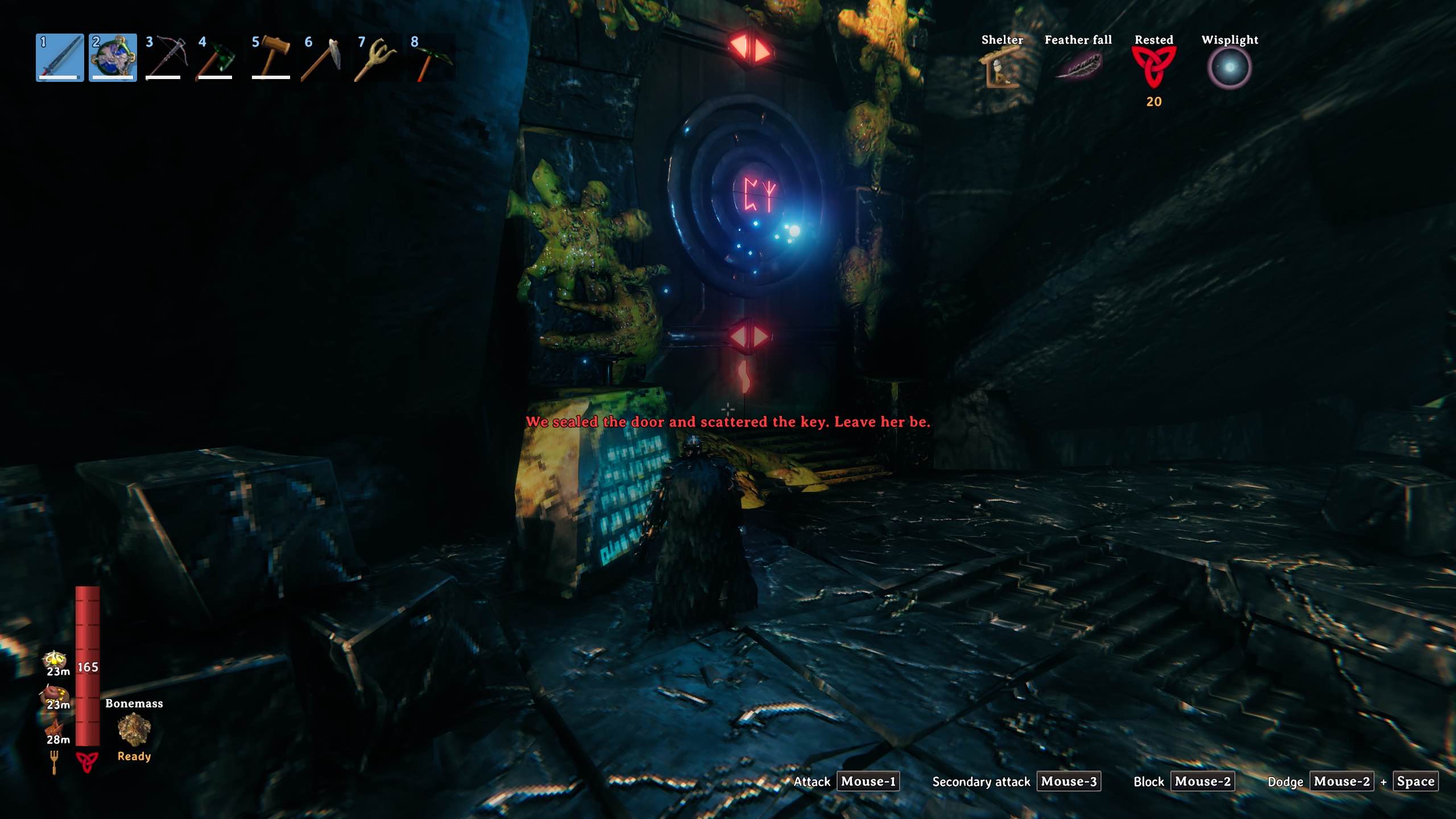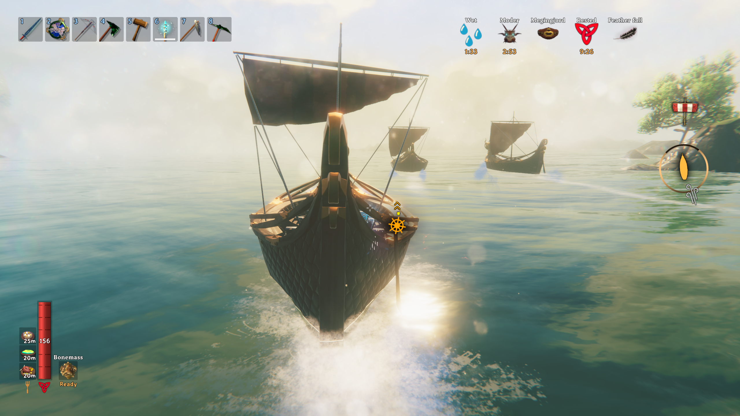 Med hjärtat i halsgropen och med kanske 1% eller 0.5% kvar av båtens durability slängde jag mig utanför relingen på babord sida med craftinghammaren i handen och bara smattrade mot ytan på en av klipporna. Ett hail mary. Bänken var röd, röd, det går inte att placera, röd, röd, röd. Grön. Bonk. Bänken ute. Jag skrek i mikrofonen “repair repair repair” och omedelbart var båten uppe på 100% hälsa igen. Tur är det väl att systemet fungerar sådär, att reparationer är omedelbara. För allt annat hade kanske slutat i att vi aldrig såg Valheims slut ihop.